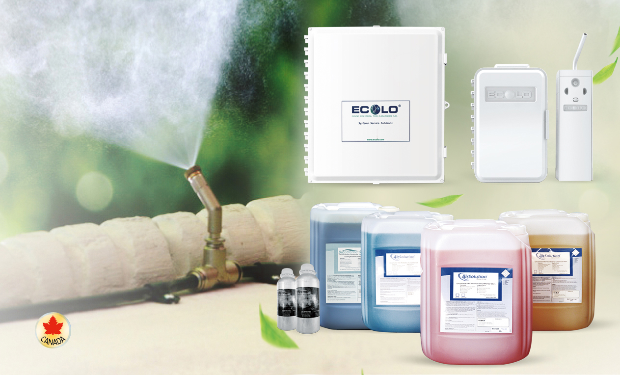 加拿大ECOLO異味控制技術(shù)的核心是從幾百種天然植物中提取植物成分,經(jīng)科學(xué)配比,配制成可以去除不同異味的、多種型號的植物提取液。配套的霧化系統(tǒng),將天然植物液霧化成粒徑很小的霧狀顆粒,霧滴具有很大的比表面積,可以有效吸收空氣中的惡臭分子,被吸附的惡臭分子,能與植物液中的酸性緩沖液發(fā)生反應(yīng),從而去除異味。